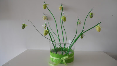 Glas mit Sand füllen, grüne Stengel rein, nur sehr wenige Ostereier dranhängen und um den Filz noch eine grüne Schleife. Und das ist nun wirklich auf meinem Mist gewachsen :lol: